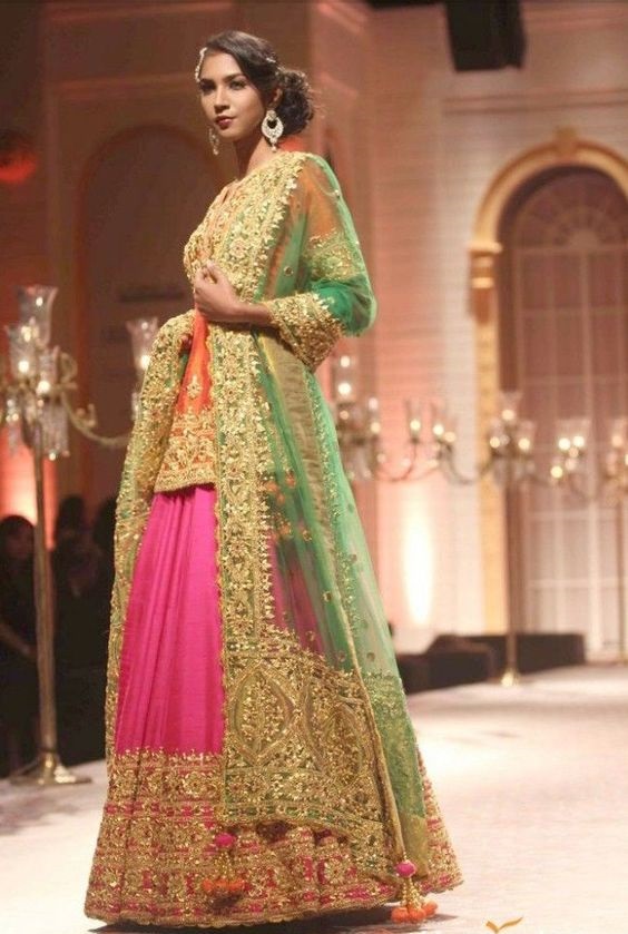 Weddings now-a-days have become much of concern for everyone. By the ever increasing and switching fashion trends, it has become very much important to strive to find out what’s going on in the fashion market in the wedding fashion domain. Bridal fashion trends is something most searched on the world wide web these days, as girls find it the most important things to search what to wear on their big day. Though the leading day on wedding events is the Barat function, yet the most focused wedding attire is the mehndi outfit which girls usually try to design in a traditional way. It is way better to design your own mehndi outfit rather than going for a designer dress, for it would save your money. Yellow color is the major tint of mehndi function which has been followed since ages and till now its grace, elegance and importance cannot be denied in any case. Yet the trend has changed a bit and a blend of green, pink, purple, blue and orange are used in bridal mehndi outfits now. Long frocks or lehenga kurtis were always common as mehndi outfits but now-a-days bridal ghagra choli styles are seen on almost every wedding function.