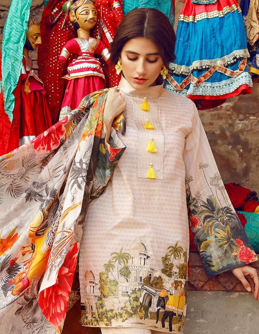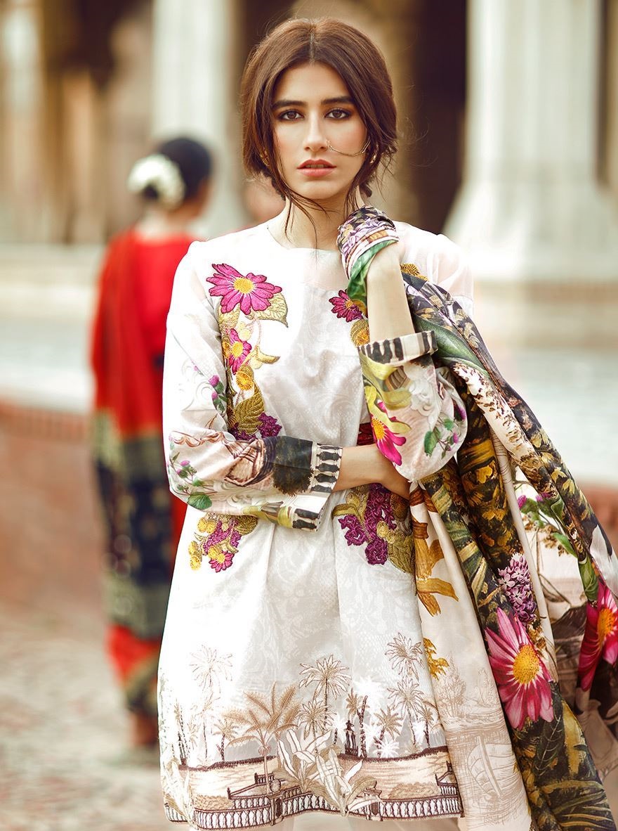 White is the most elegant color loved by most of the ladies. Especially on occasions like Eid, white decoarated with colorful embroideries is gretaly loved and admired by all. This beautiful white colored pima cotton lawn outfit by Cross Stitch has very neat and intricate colorful embroiderd patterns on neckline and hem.