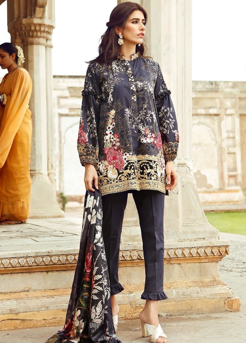 Coal Sand is a very elegant design of Cross Stitch Eid Range in light shade of black decorated with chic embroideries on the shirt hem.