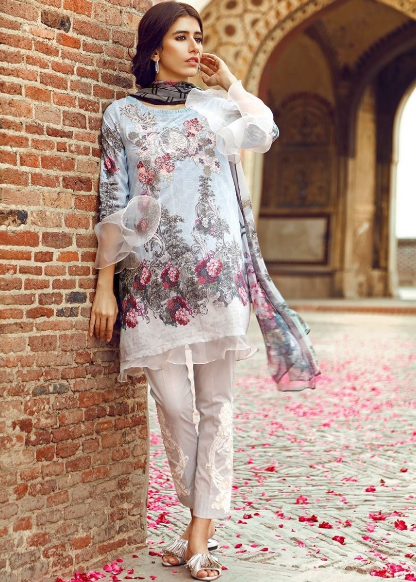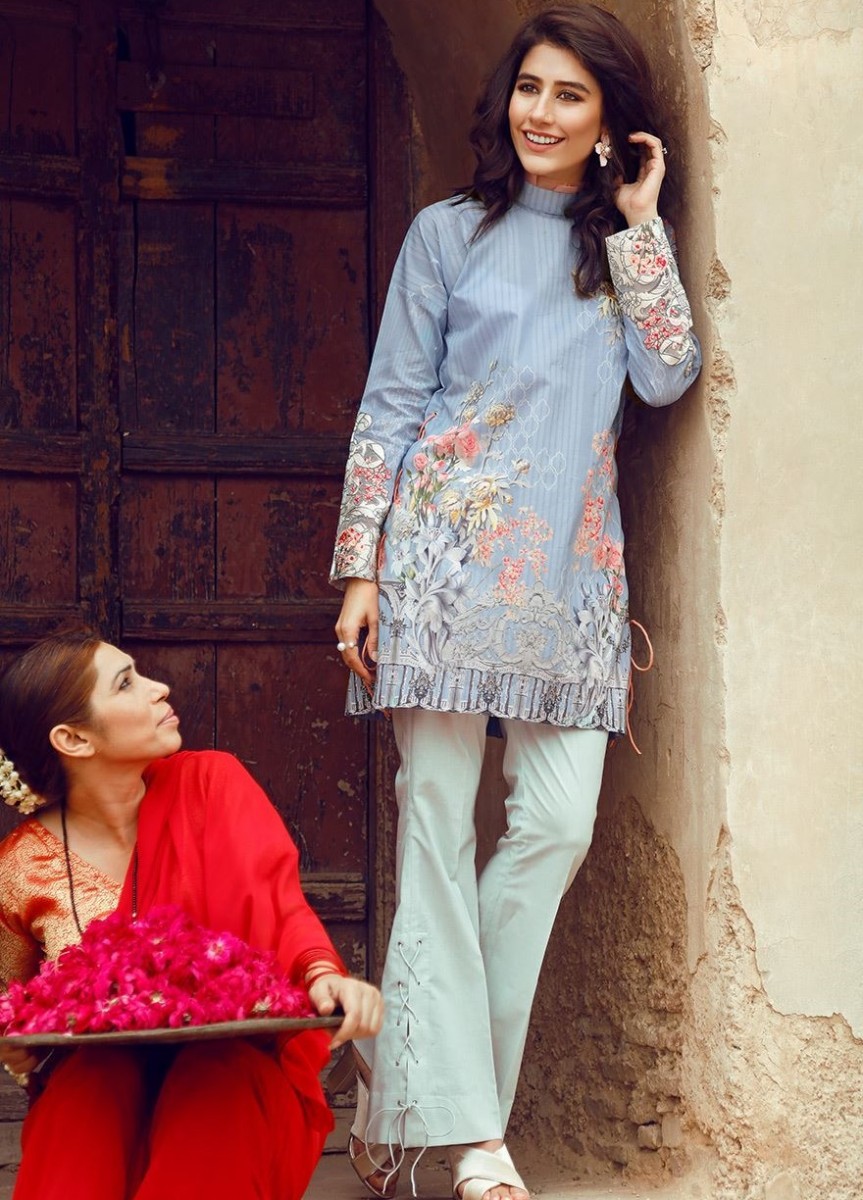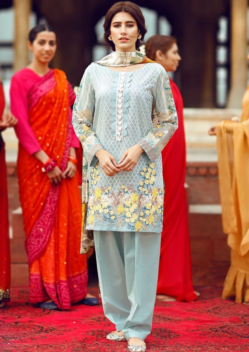 Here comes another fabulous unstitched article of the Cross Stitch Festive assortment ready to win hearts of many. This dress includes a beautiful light blue colored pima cotton lawn kameez, a cambric dyed shalwar and embroidered sleeve motifs.