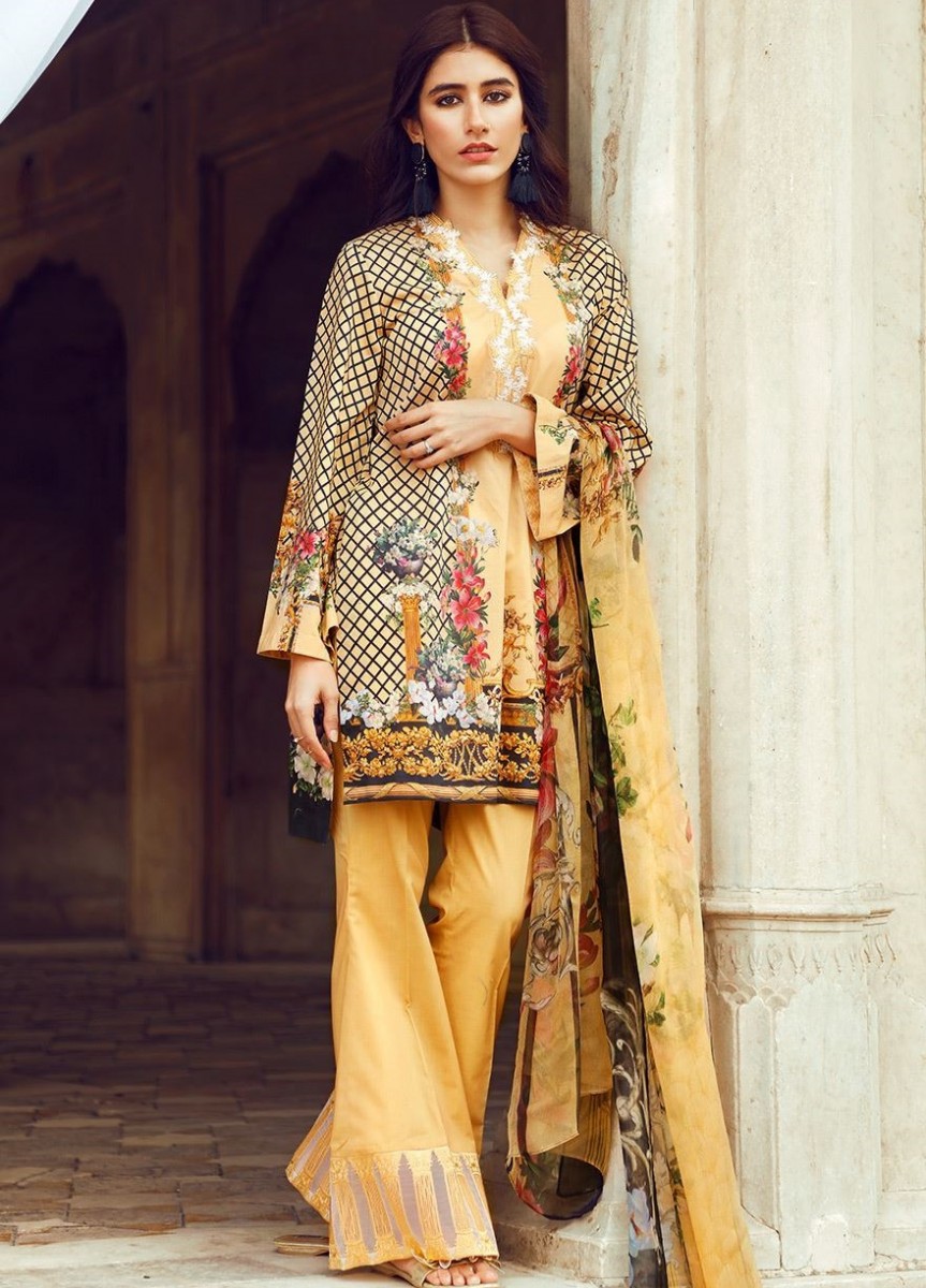 Floral printed yellow cotton lawn Eid dress with embroidered neckline and trousers