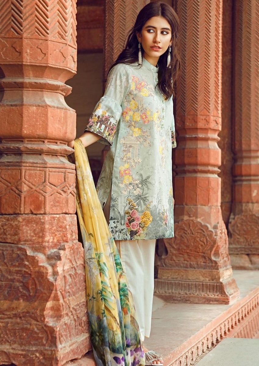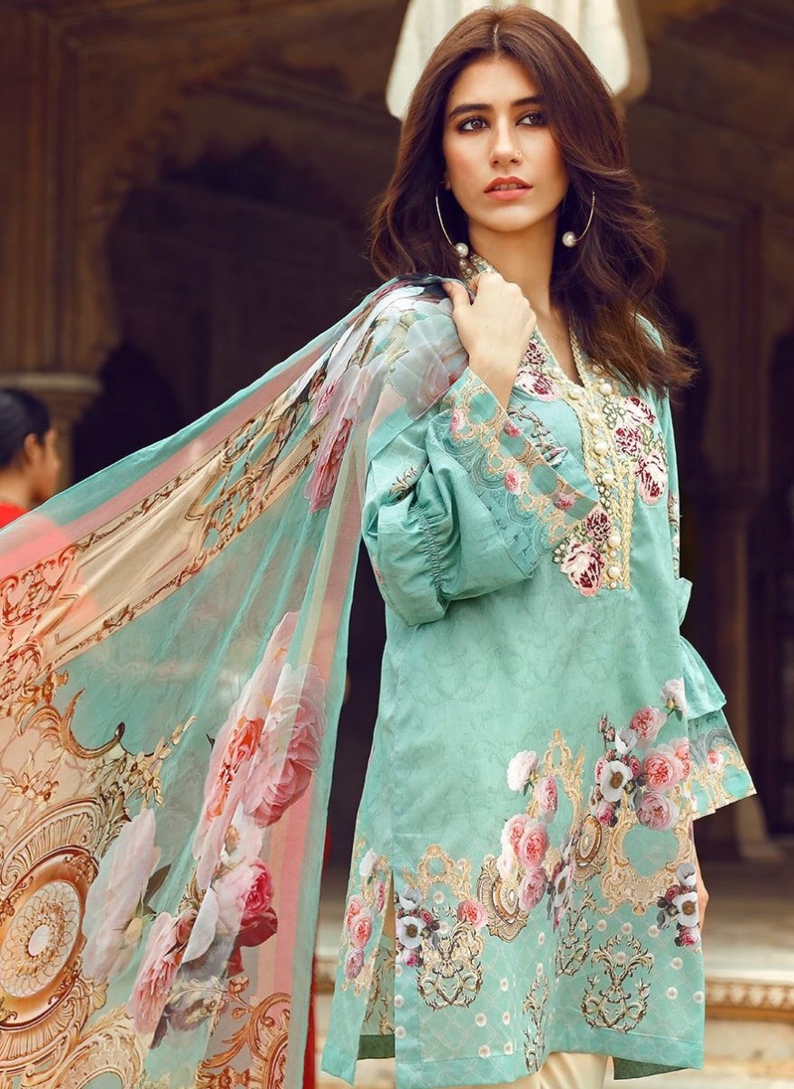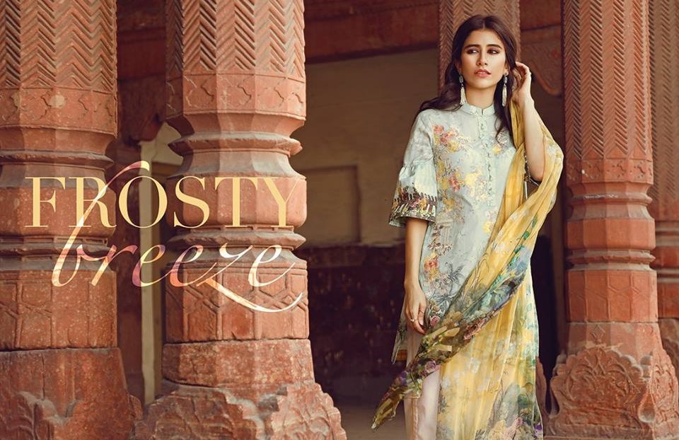 As the name indicates, this digital print of cotton lawn has a very cool and frosty shade of green enough to give a cooling and soothing effect to eyes. So, what could be better than this cool outfit if you are really searching for cool colors this festive season? Its pure silk chiffon wrap adorned with digital prints and the embroidered neckline motif is making it look even more soft and cool.