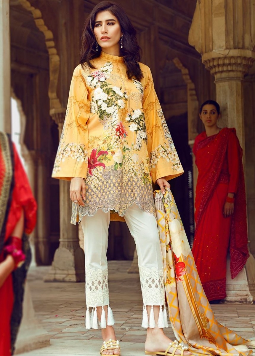 Syra Shehroz is making a statement for the upcoming festive days with this adorable yellow floral digital printed outfit with a floral silk dupatta and embroidered enhancements for trousers and neckline.