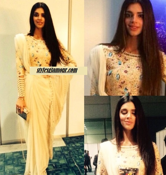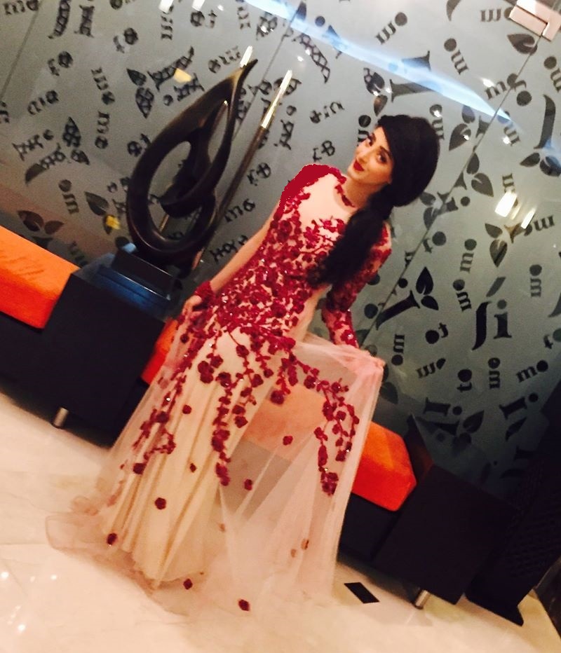 Sanam’s skin colored maxi with red embroidered work was extremely wonderful.