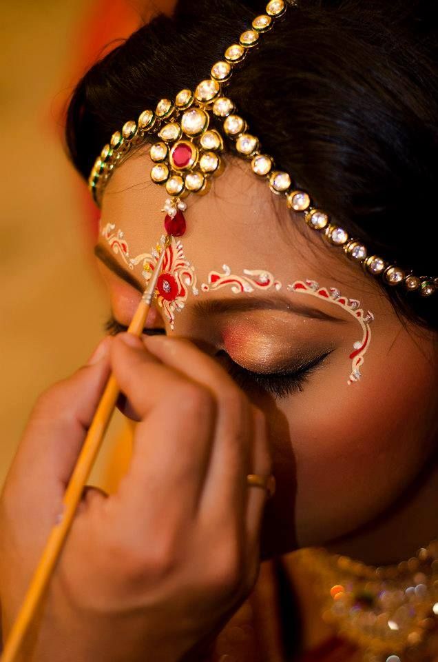 Step 6: For the Bengali bride, (If you are from a bengali family) the forehead decoration is a must-have element. We’d suggest that you get a professional or an artist in the family to help out. You don’t want this getting messy and ruining the make-up you’ve done so far.