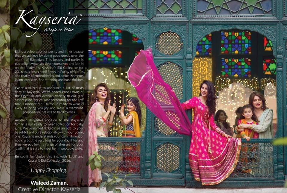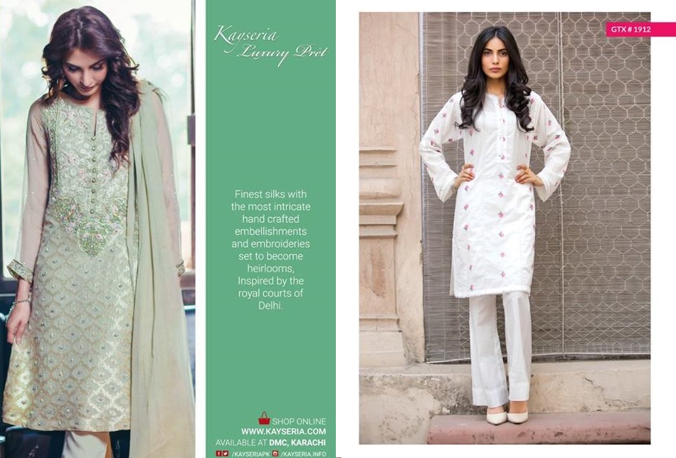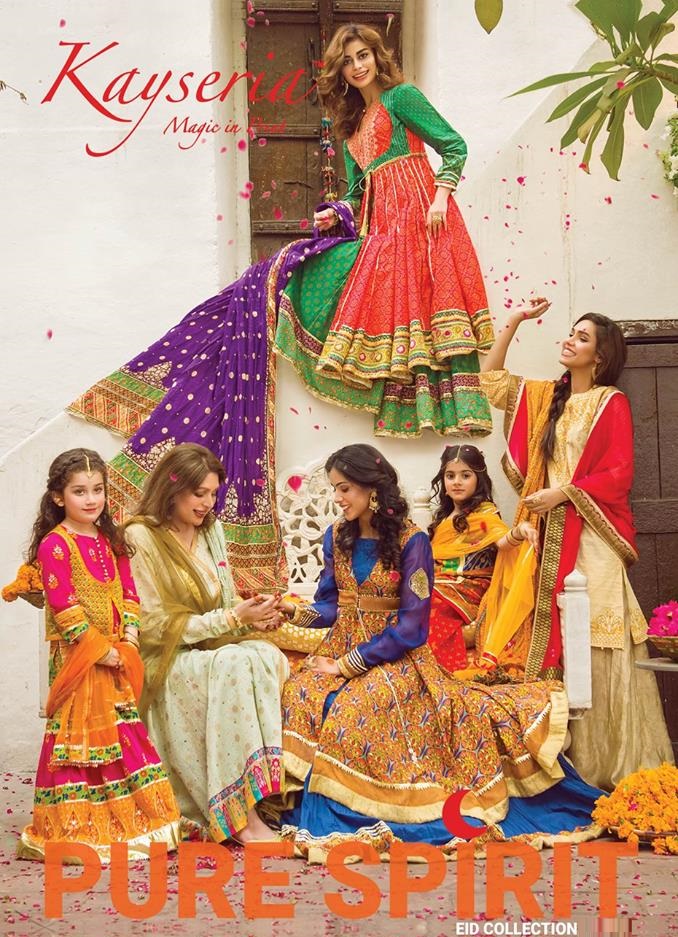 Kayseria is a brand name of quality and is loved by people not in Pakistan but in the west as well. The brand is dedicated to bring upon quality fabrics for women since a long way back, as it was founded in 1985. The name has been derived from “Kayser” which stands for Safforn. So, as the name depicts, the colors introduced by the brand are bright and funky. Every fashion forward lady opts this popular brand for her casual and formal wear in every season. Kayseria has always been the best in designing unique seasonal as well as festive outfits. Have a look at the wonderful dresses of this beautiful collection designed especially for the upcoming festival.