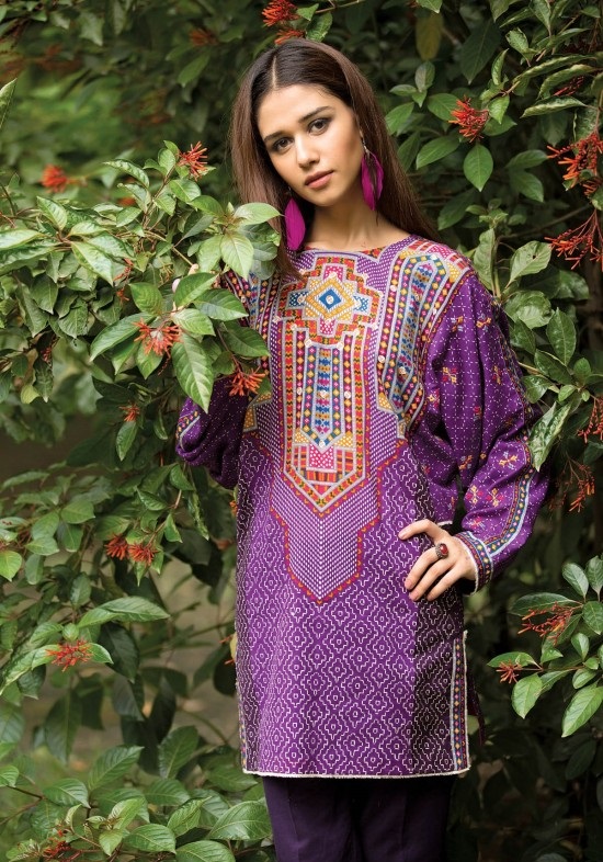 Purple has a royal essence inside it. This dark purple embroidered khaddar winter outfit by Kayseria is a perfect combination with multi-colored print and embroidery on neckline.