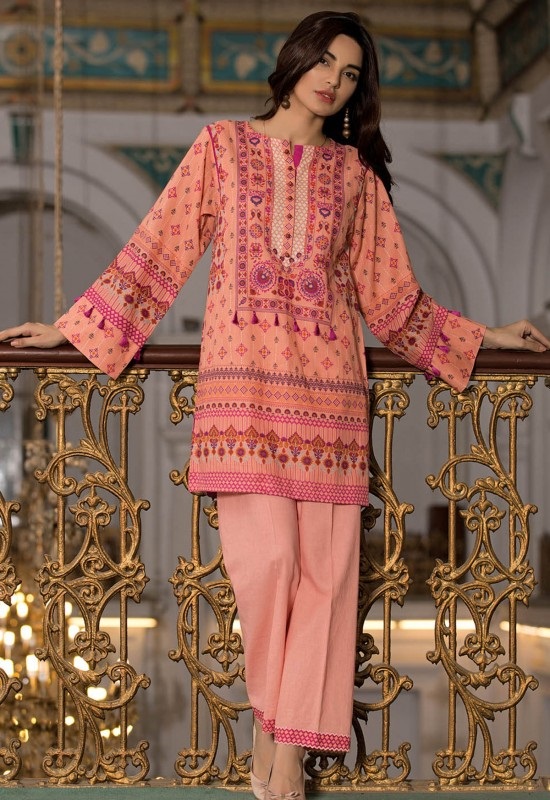 This peach colored printed khaddar kameez is a very attractive article of the assortment.