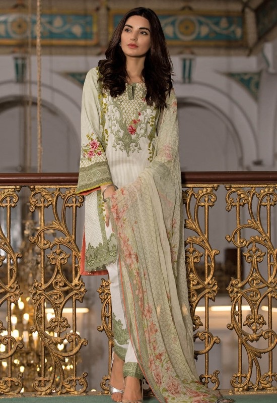 Colors always seem attractive but the grace of white still remains there no matter what. This elegant white outfit with pink and yellow print on border and sleeves has an intricate embroidered pattern on neckline.