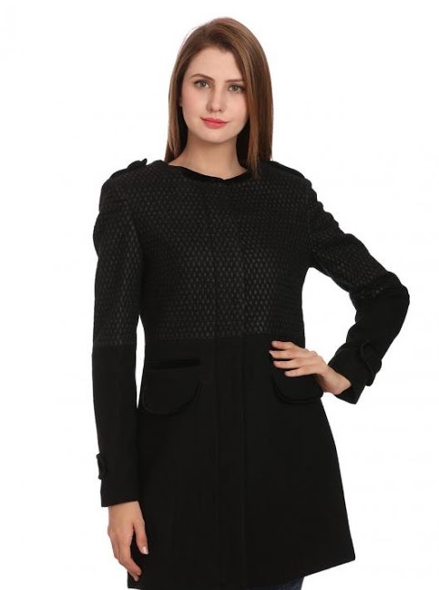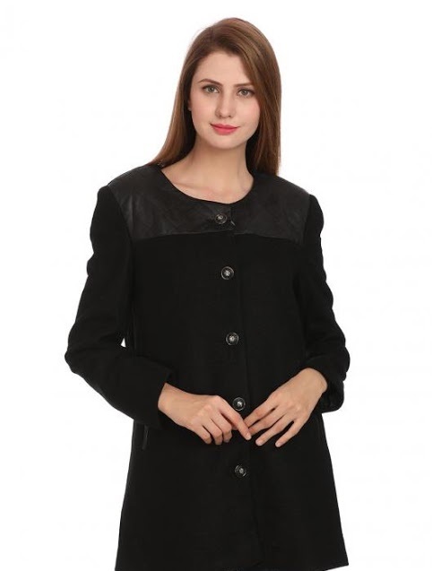 This black beauty is patched with leather around the shoulders. The shiny buttons used are tastefully complementing the glare of the lovely leather.