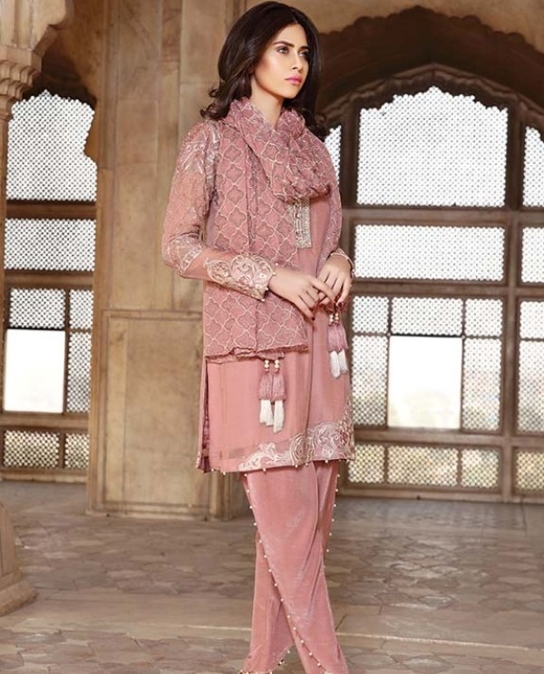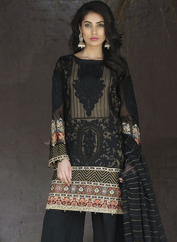 Black is always classy. When decorated with light gold or multicolored embroidery, it shines with even more allure and charisma. This breathtaking design of embroidered crinkle chiffon in jet black is something very classy to wear on Eid.