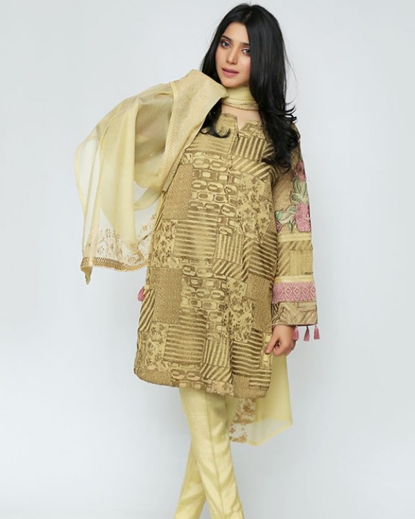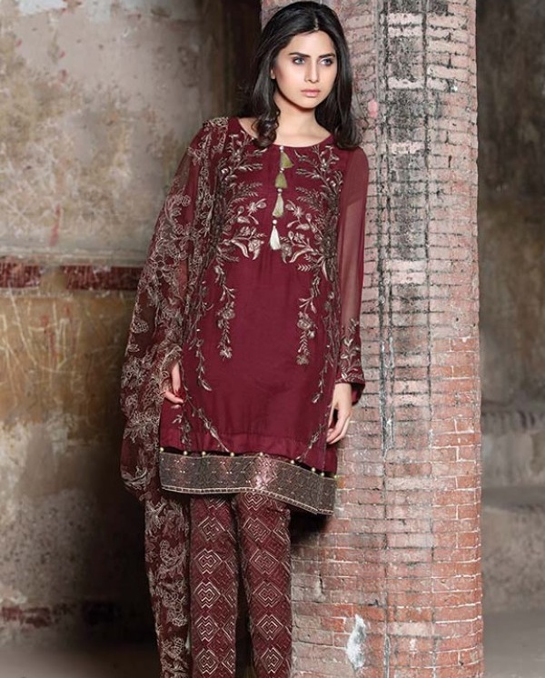 This dust storm colored crinkle chiffon Eid dress decorated with chic embroidered patterns on it is a perfect pick for the festival. Adding to its allure is its embroidered trouser and the beautiful chiffon dupatta embellished with embroidery.