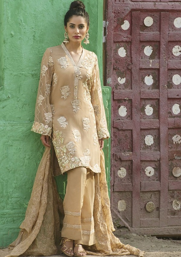 Dark Vanilla Colored Embroidered Eid Dress with Pure chiffon Dupatta: