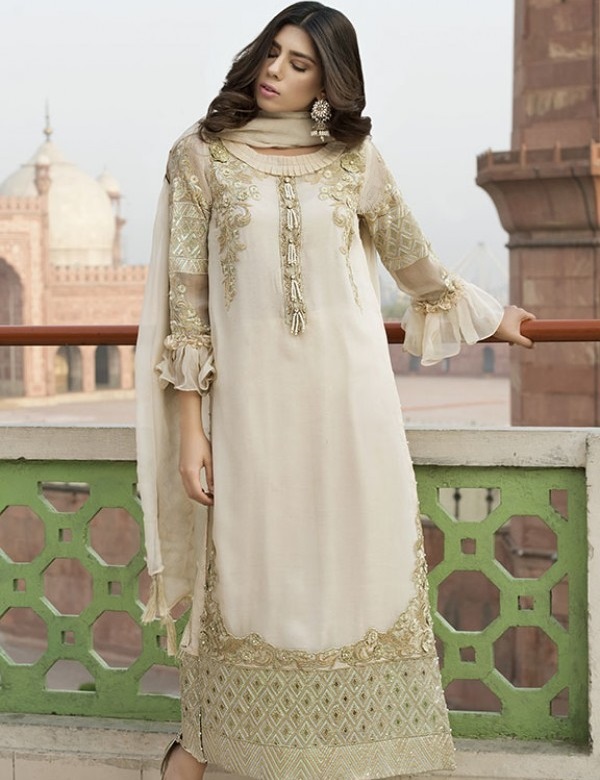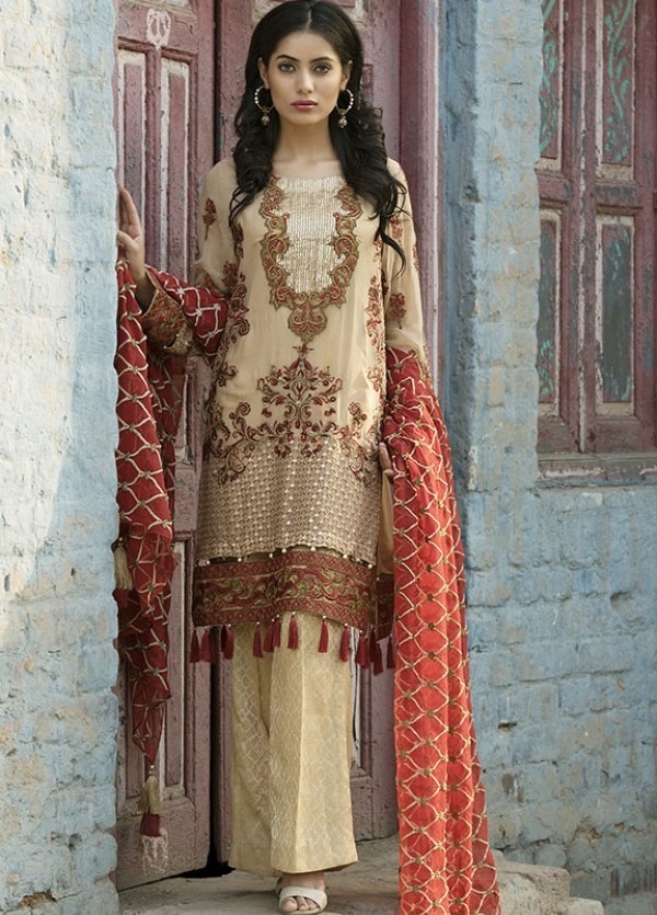 The most elegant design of the series in dark Vanilla color with delicate hand embellishments on the shirt is right here. It has been complemented with a very beautiful pure chiffon dupatta with elegant embroidered patterns along with embroidered silk pants.