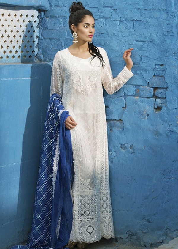 White Embroidered Eid Dress with Pure Chiffon Blue Dupatta:
