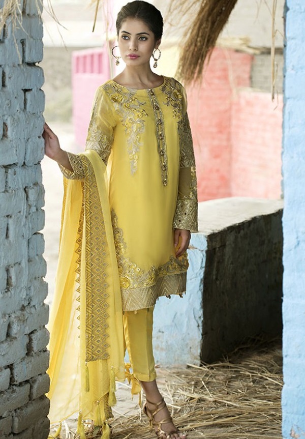 Yellow appeared as the most trendiest color this summer. This stunning shade of yellow enriched with neat hand embellishments on the shirt paired with a pure crinkle chiffon embroidered dupatta is all set up to help you look the trendiest this Eid.