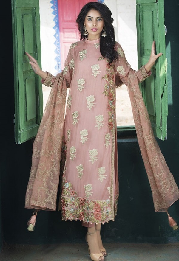Spanish Pink Crinkle Chiffon Eid Dress with full Embroidery: