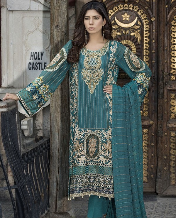 This beautiful design of three piece crinkle chiffon Eid dress in Turquoise green shade is decorated with intricate embroidery and paired with a pure crinkle chiffon embroidered dupatta in a slightly darker shade of green making a perfect contrast for the festival.