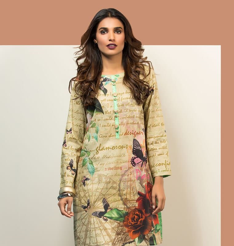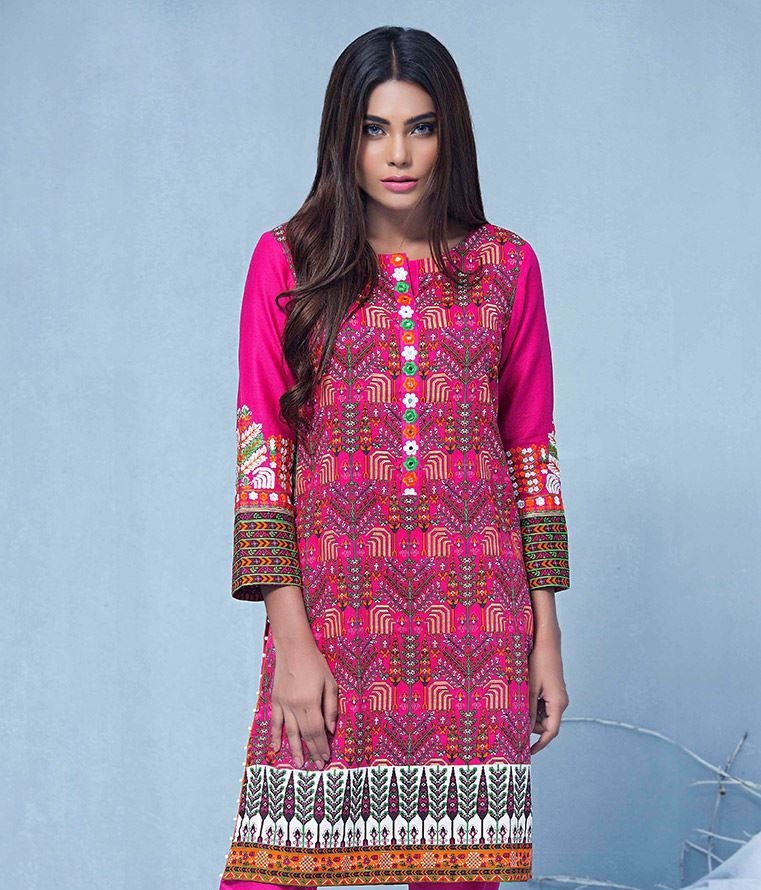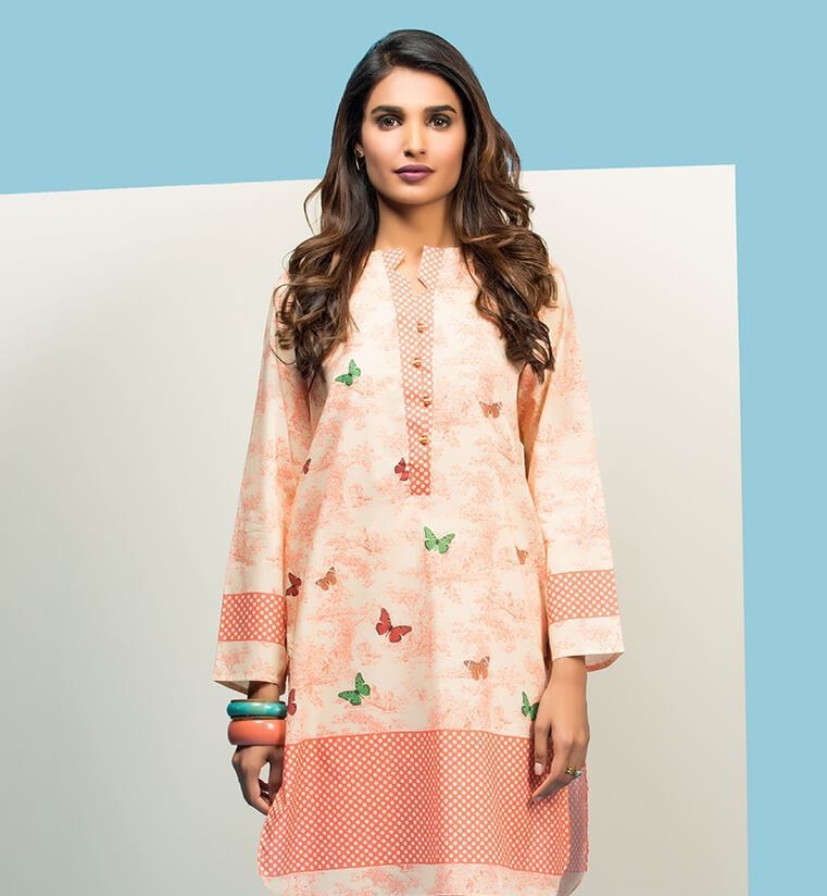 The Fantasy Land pink kurti with pretty colorful butterflies all over the front offered by Orient is a lovely winter wardrobe solution. It costs 1,950 rupees in unstitched format while the ready-to-wear tunic costs 2,250/- PKR.