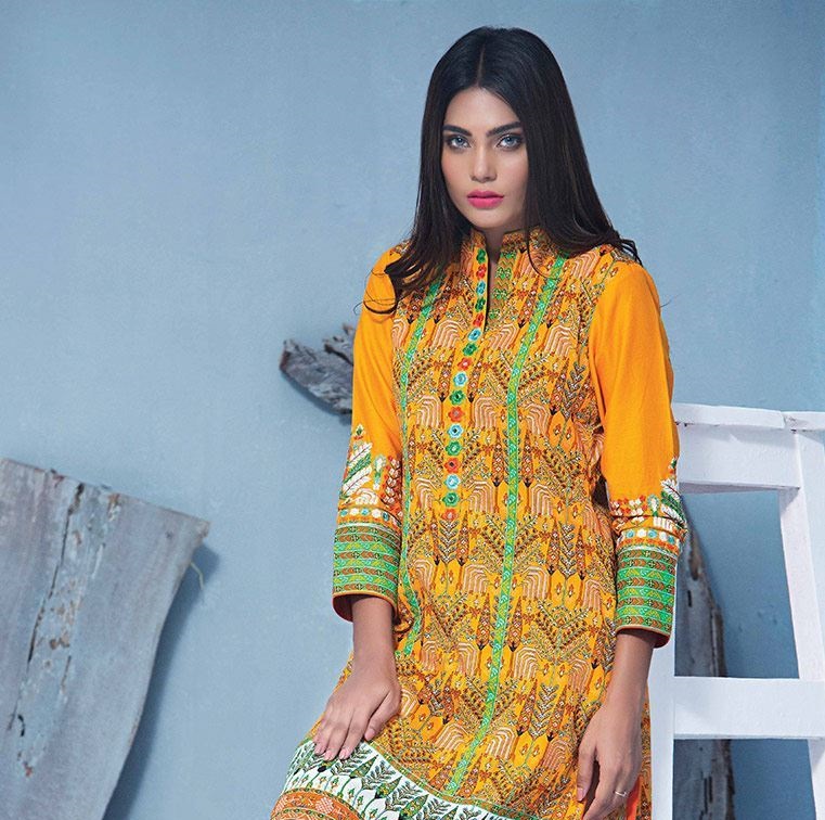 This saffron colored cottel shirt is complemented with hand embroidered border and embroidered sleeves. It can be bought worth 1600 rupees only as unstitched shirt. While in RTW format it is available in 2,350/- PKR.