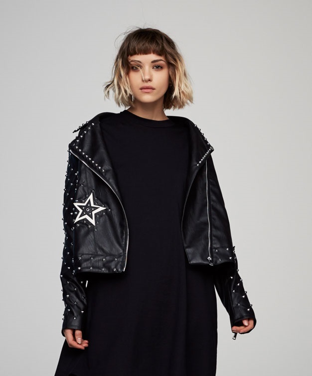 This chic and stylish biker jacket looks amazing in all its black glare. The mesmerizing patch design at back and front will tempt you into it.