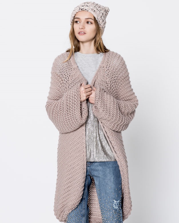 This is another cool style of carrying that same knit pattern sweater over the top. It is front open coupled with full length loose sleeves. It is longer in length and goes with jeans.