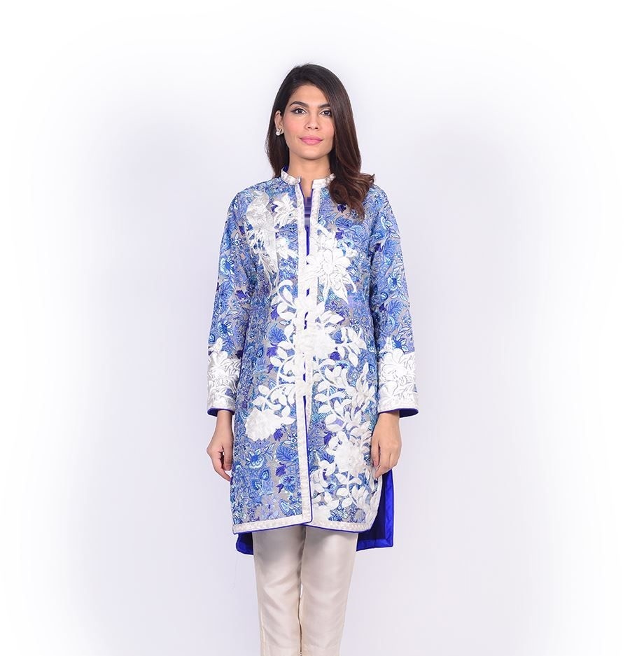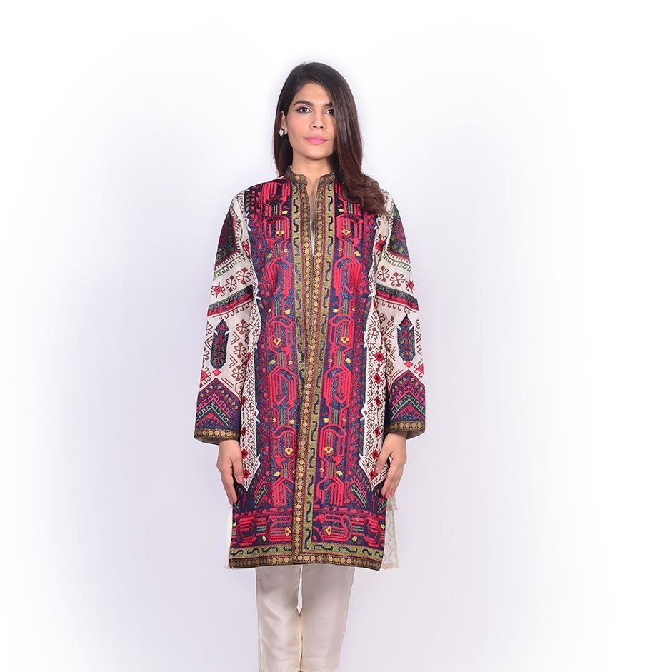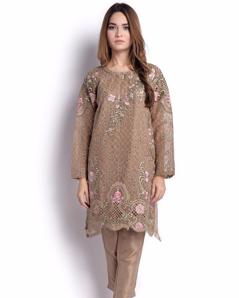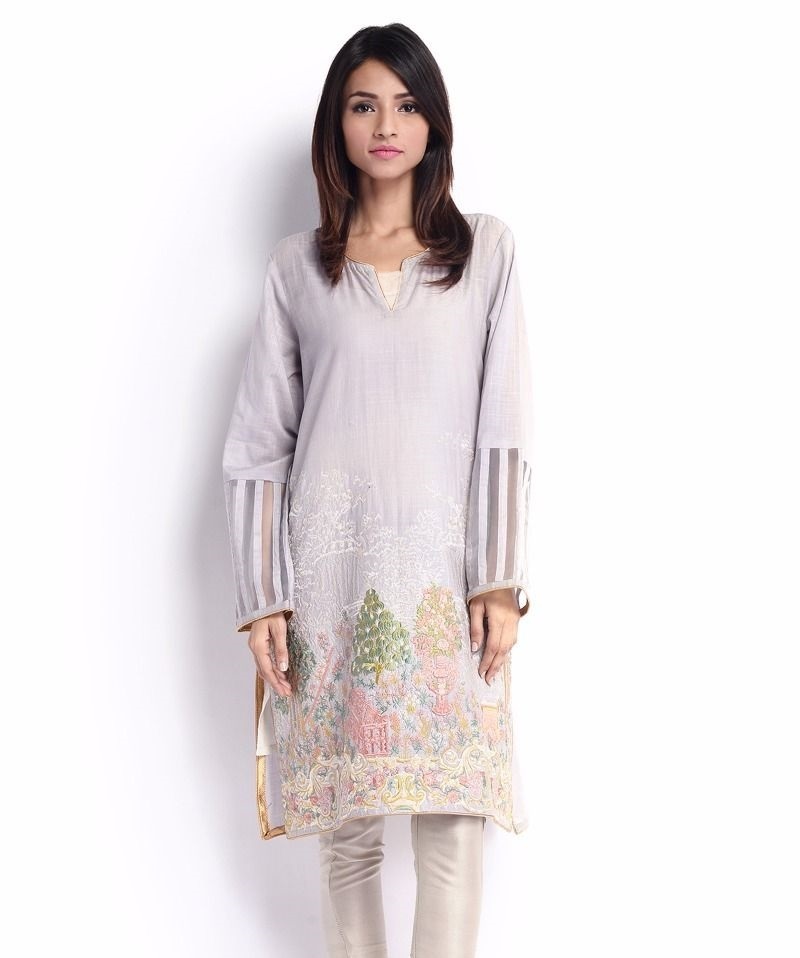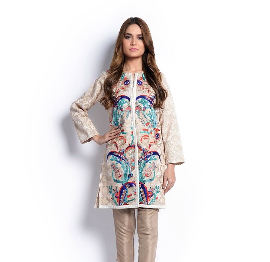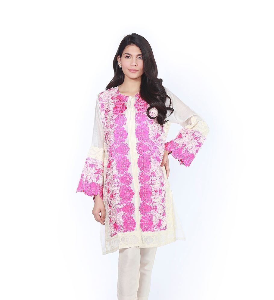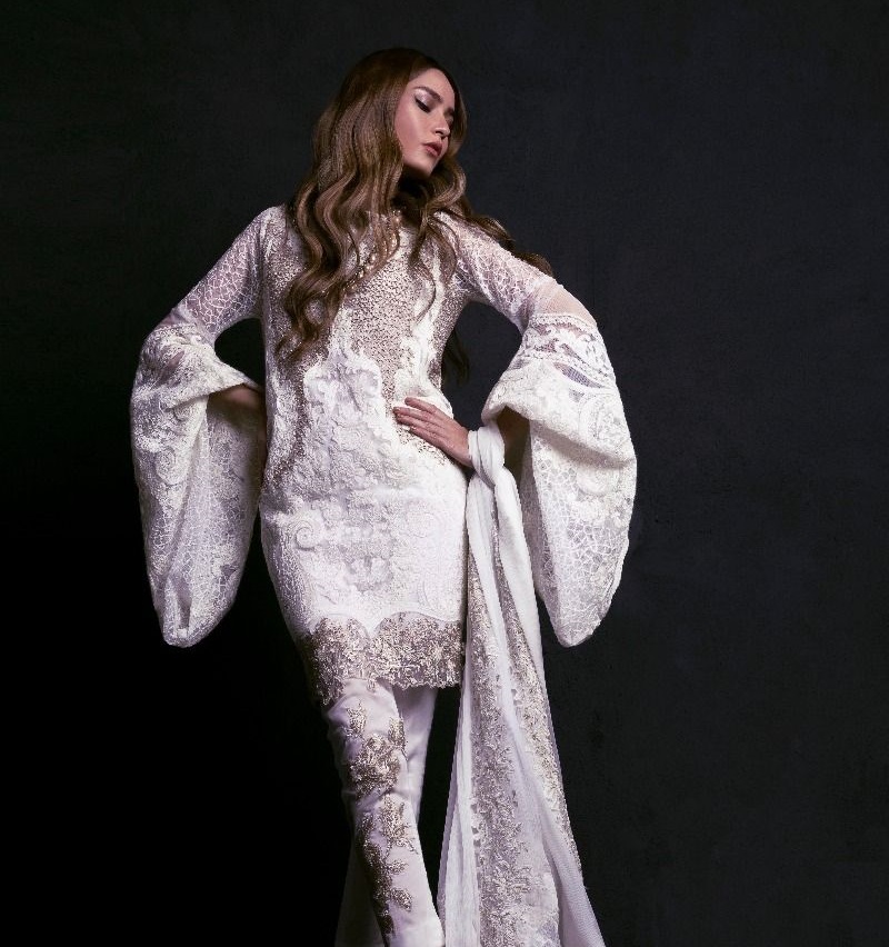 White is one of the most trendiest and graceful colors loved by all. This beautiful design of white polynet shirt by Sana Safinaz, having embroidered sleeves and a large floral tilla embroidered bunch is complemented with an embroidered white dupatta and plain pants.