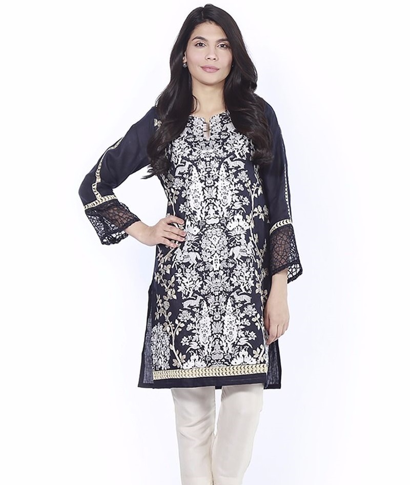 Go classy this Eid with the black organza floral embroidered shirt by Sana Safinaz, embellished with beading and embroidered bunch in white. It has been complemented with a polynet dupatta having white pearls all over it and a plain trouser.