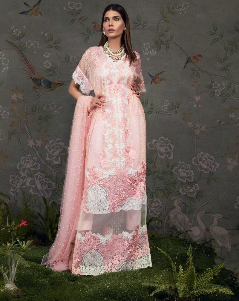This soft and smooth design in baby pink color has a poly net stuff, decorated with geometric patterns on the shirt’s back, a floral tilla embroidered bunch and embroidered sleeves. Making it all the more classy is its heavily embroidered dupatta with special detailings on the pallu.