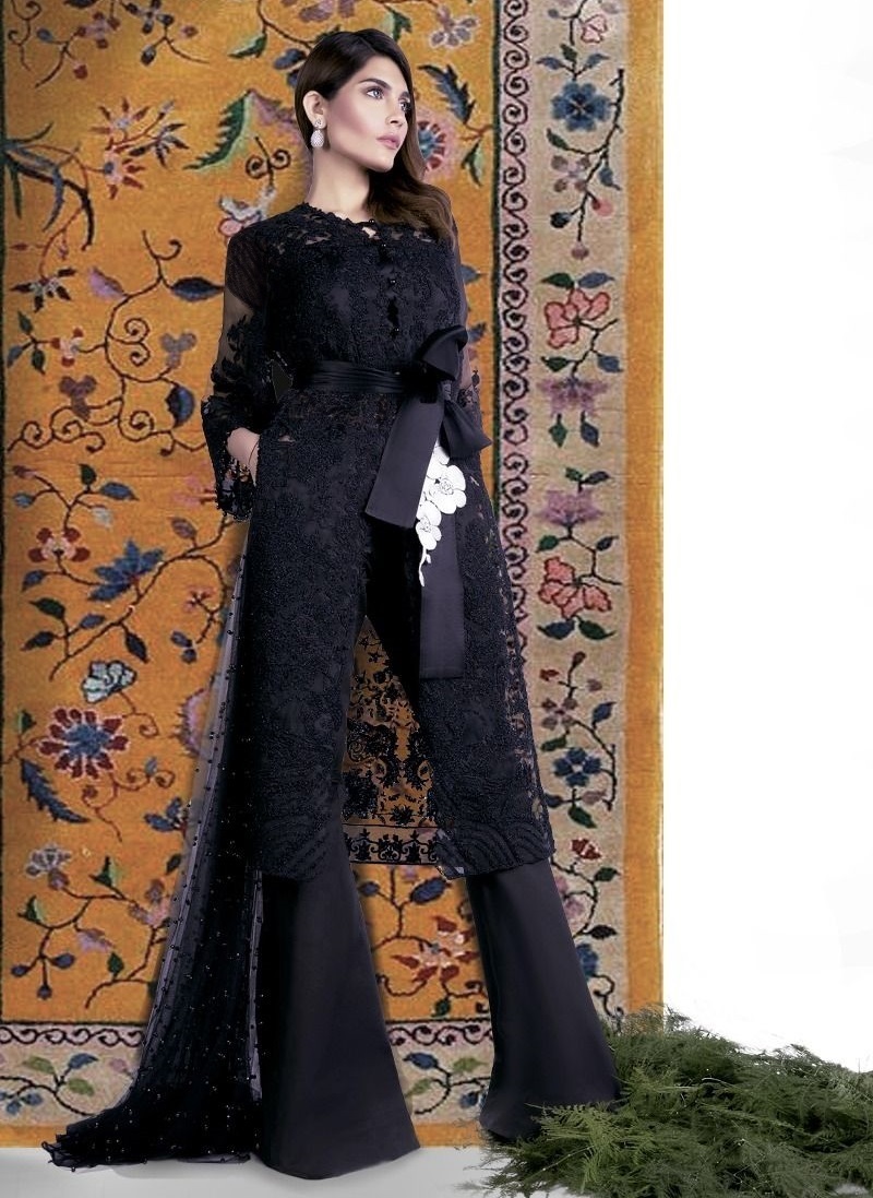This is another design in jet black organza stuff decorated with floral resham embroidered patterns on the shirt, poylnet dupatta with pearl detailing and a plain black trouser.