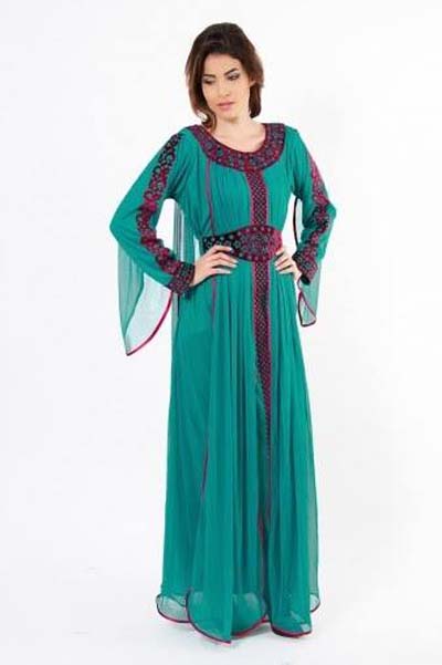 Here comes a wonderful collection of graceful and elegant Abayas just according to latest trends of the year 2014. Abaya is a religious costume worn commonly by Muslim women throughout the Islamic world. The word basically comes from the Arabic language which means purity like water. There is no doubt that the real beauty of a woman is in her modesty. Further it gives a graceful touch to one’s personality and adds to their beauty. Muslim women are supposed to cover their body from head to toe and the best possible garment to cover them up is an Abaya. It is basically a piece of cloth that lets her cover the body in an appropriate way. It has an Arabic background, as it was initially worn by Arabic women years back, later become popular in Middle East and Asian countries, yet now becoming an increasing trend in almost all regions of the world including the Muslim community in Europe. A few years back an abaya or a gown was supposed only to be a black loose cloth in a plane and simple style with no decoration or embroidery, while today the case is completely different. Now a days abayas are designed with light embroidered work, stones, beads and laces in different manners. Further the traditional black color has been replaced by other funky and charming colors. These are stitched in various styles like long maxis, frocks and open gowns. The top most trend of the abaya these days is the Kaftan style that seems just like a flying bat, yet looks pretty cool especially for young ladies. Stylish broaches and necklines are used extensively for giving a formal look. Since an Abaaya is generally worn above clothes, the stuff used is typically thin and soft, as it becomes extremely irritating to wear an abaaya over clothes in summers. Chiffon, silk and cotton stuff is used preferably these days.