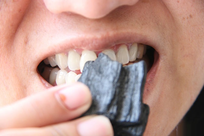 Take a piece of charcoal and rub over the surface of your teeth and not the gums. Rub for about 1 minute and wash away with water. Later brush them with a toothpaste.