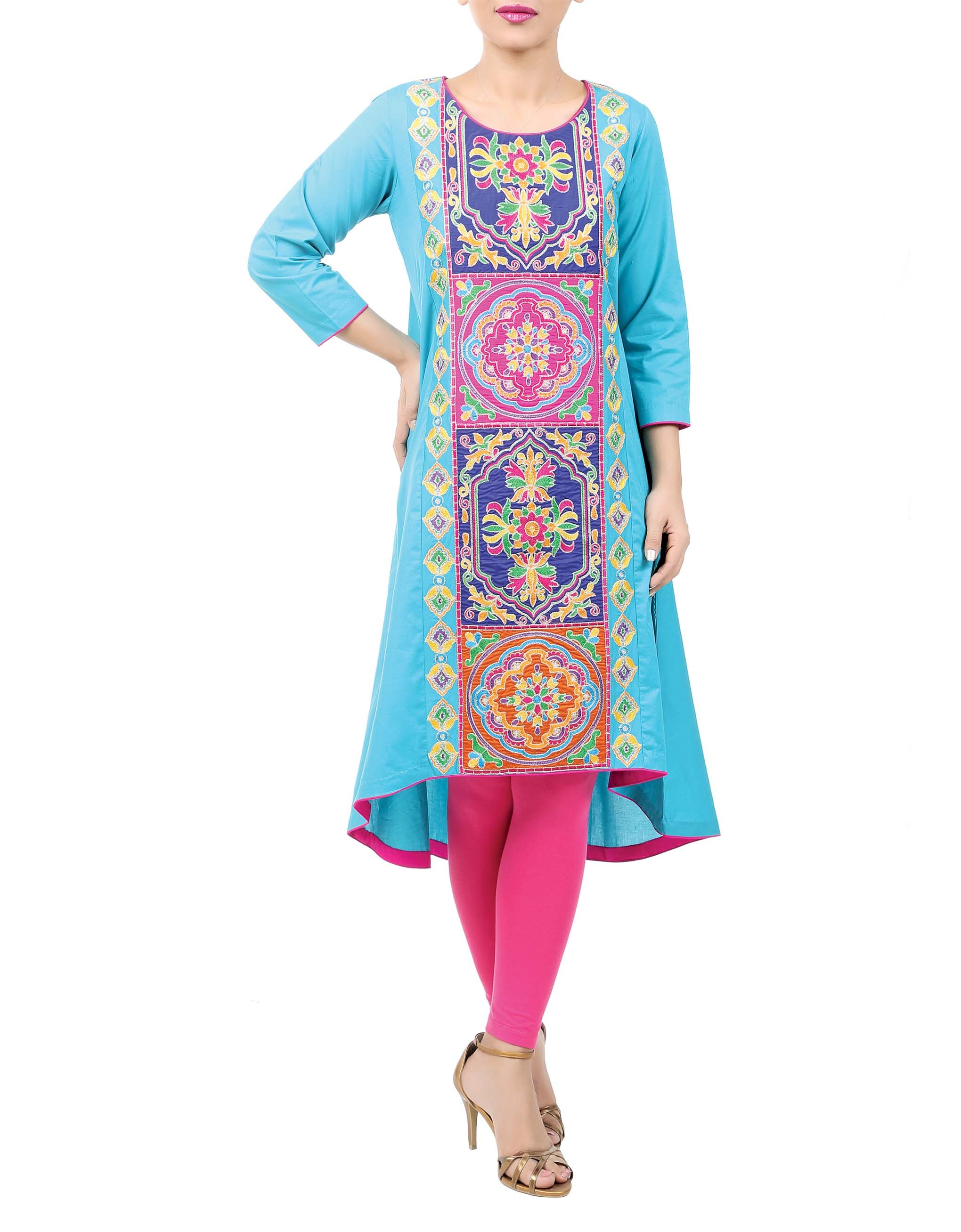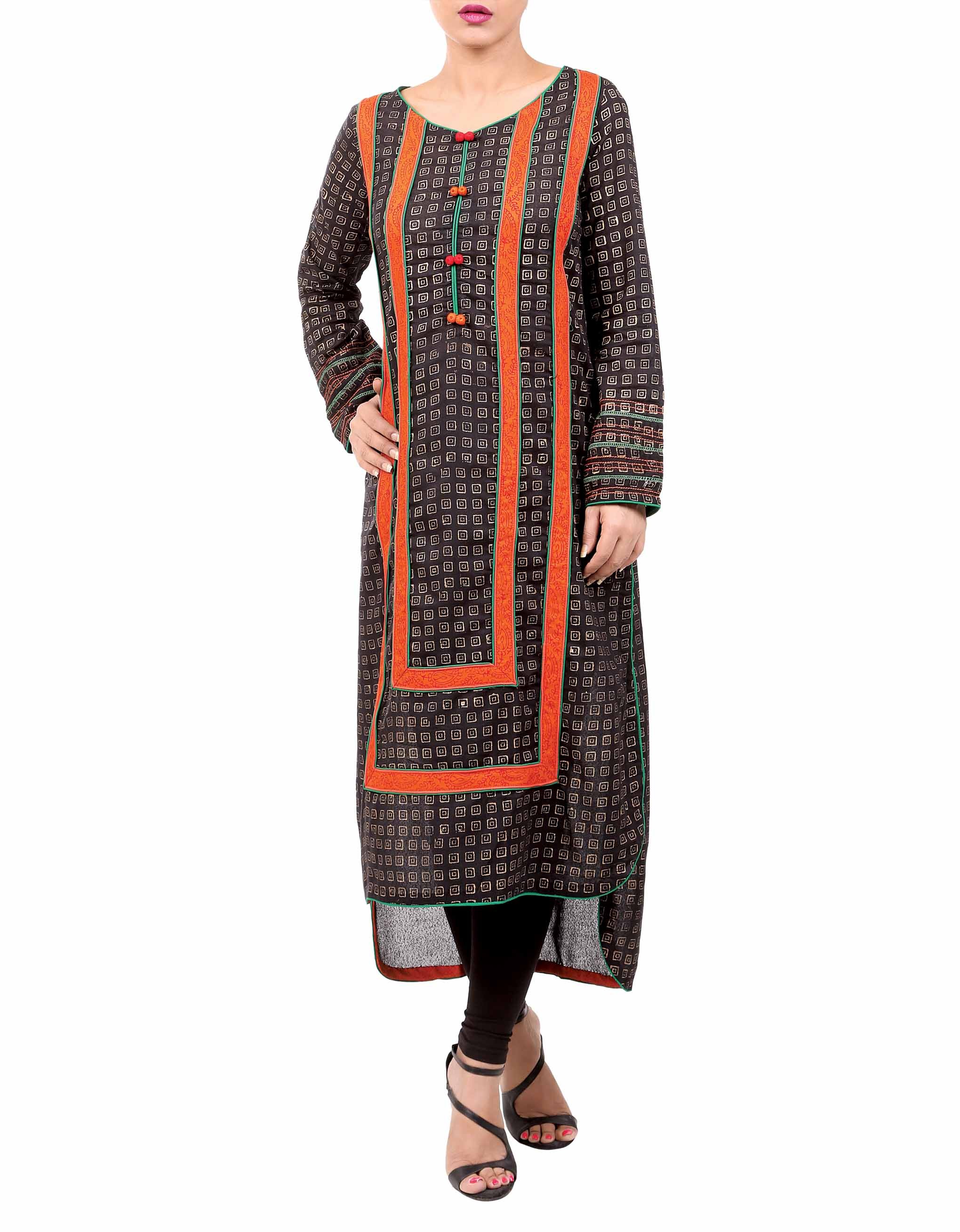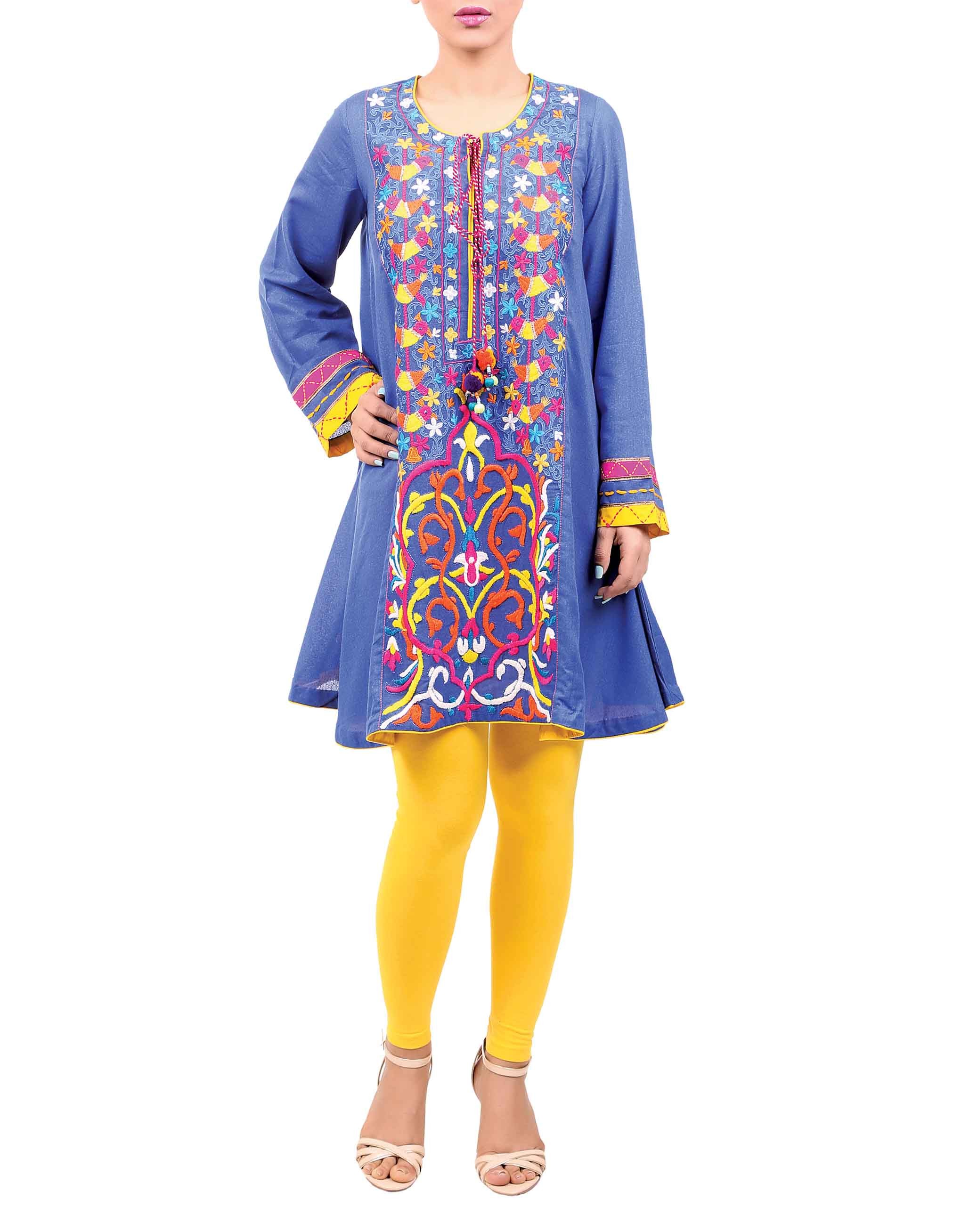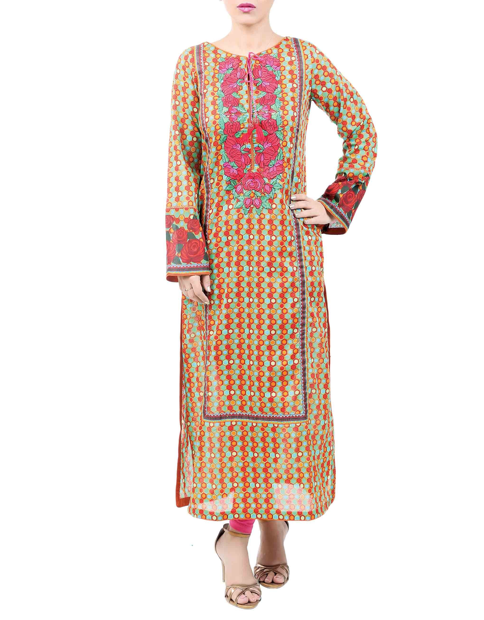 Rang Ja Eid Collection 2014 is a must-have festival collection offering an opportunity to wear style, trend and glamour this Eid. It has brought upon a pretty range of ready to wear stylish outfits for women stitched in spectacular and trendy designs like tops, kurtas, short kutis, long shirts along with bottoms like churidars and specially designed salwars in bright and funky colors with thread and tilla work on lower borders. These salwars can be paired up with any of these funky shirts to enhance their beauty and elegance. Let’s have a closer look at each of these dresses in the following photo gallery, containing all of them. Do not forget to share your views about this collection in the comment section below. Stay tuned for more updates and latest collections. Have a cheerful Festival.