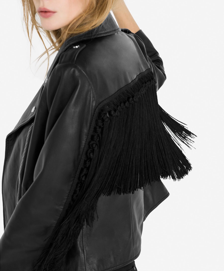 It’s a traditional cowgirl style jacket with the black fringes at the back of the shoulders. The entire jacket is however crafted in leather.