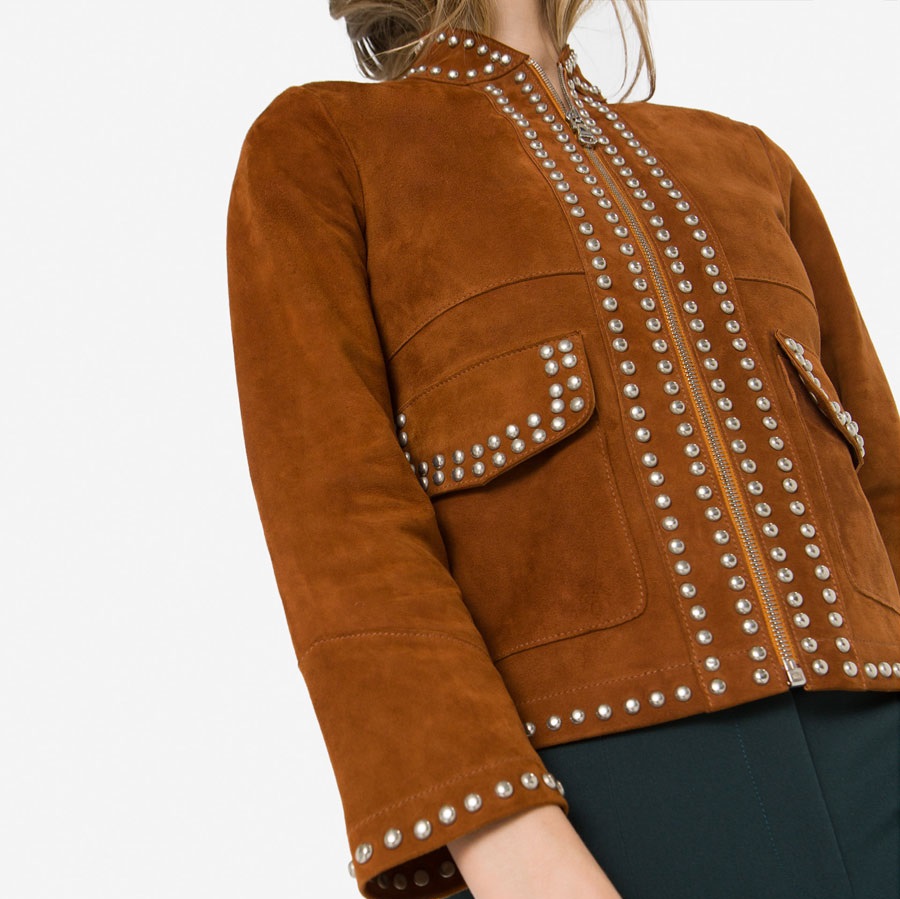It has this lovely brown which is adorned with numerous silver studs all over the borders. It’s open through a zip, while the pockets are kept prominent in the front.
