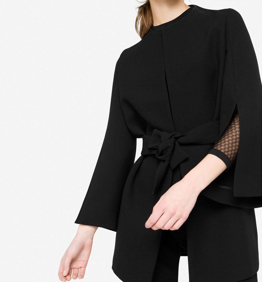 The cape with bow is a unique style of outerwear which looks even more appealing with the matching bell bottoms.