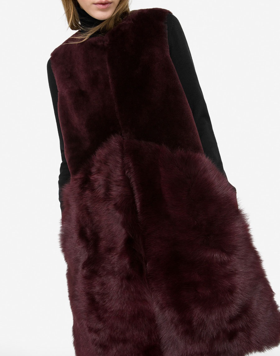 It’s a classic fur coat in plum. With quite fury bottom attached to the waist. Covering the length upto the knees, this waist coat will suit any inner wear of your choice.