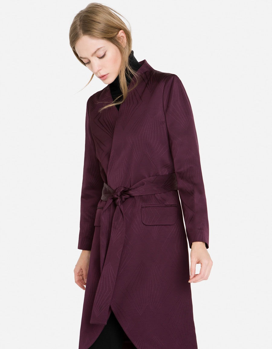 The coat is made out of pure jacquard in mild plum. The front is sealed with the waist belt and a knot. The pockets are fused down the waistline.