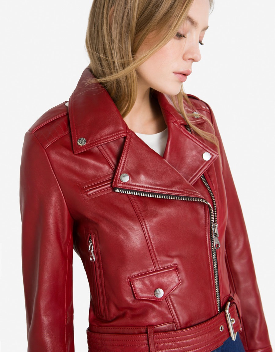 Multi-pockets with zippers, metallic collar studs and prominent stitch lines, makes this leather jacket looks extremely classy. Moreover the belt at the waist brings fit to the size.