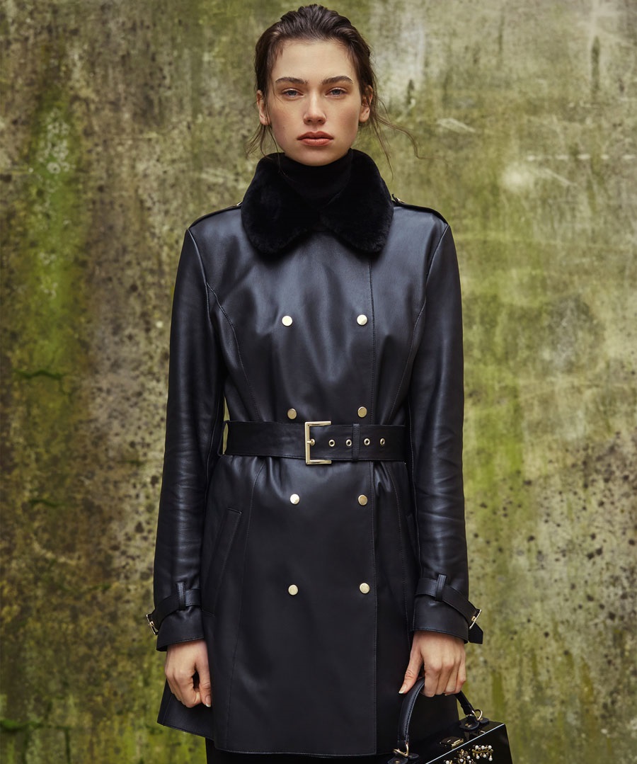 10. LEATHER TRENCH COAT WITH FUR COLLAR:
