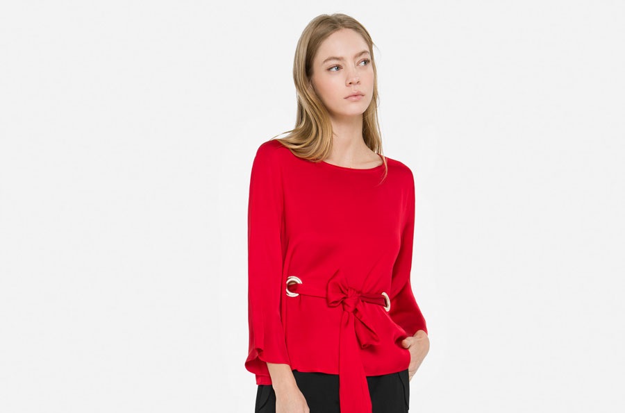 Its simple smart looking blouse. The waist belt is fused into the top, tied into a front bow. Sleeves are bit bell around corners.