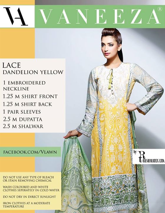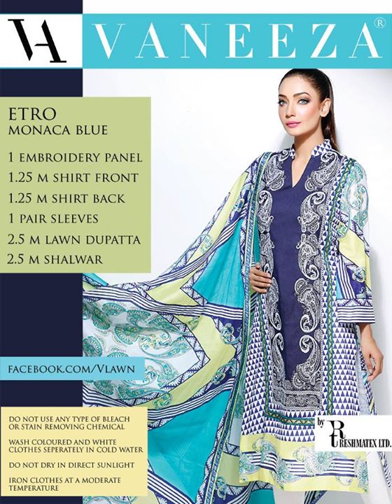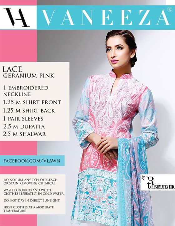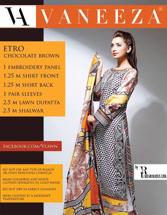 Vaneeza V Lawn is a renowned clothing brand being owned by Vaneeza Ahmed Ali, Pakistan’s very popular and leading fashion model. She being a very talented and charming model from Pakistani fashion industry started her designing career back in 2006. Her label under her supervision has been performing excellently with outclass designs which are loved by all the women having a good taste in fashion and style. No matter which sort of dresses you love to wear Vaneeza V lawn can provide you with best ever wardrobe solutions. Having a good command on designing brilliant lawn designs, the brand also deals in silk, Swiss Voile and chiffon.