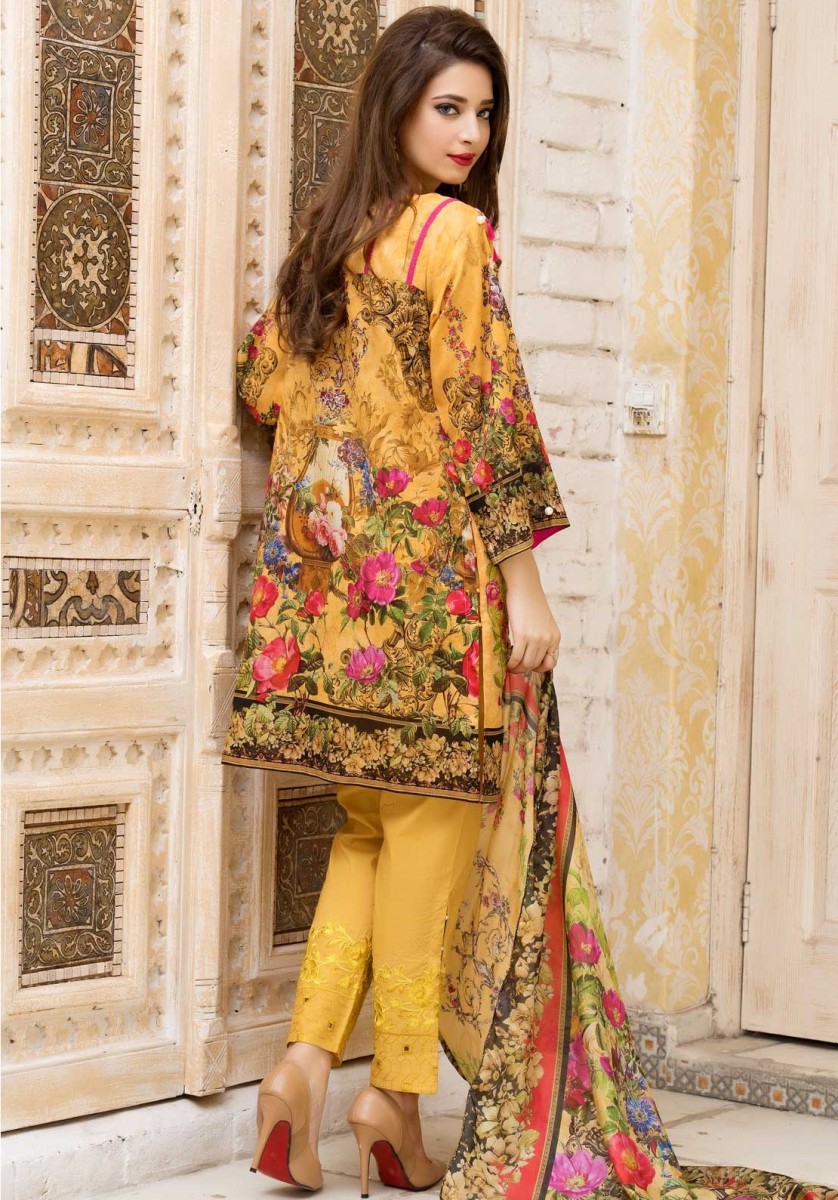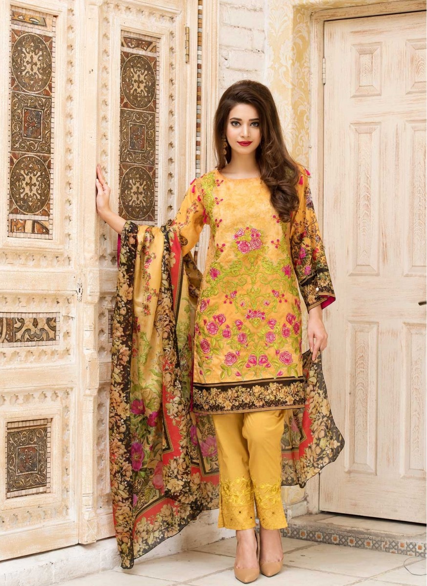 Shine this Eid festival in this adorable Indian Yellow embroidered lawn outfit by Warda. With its fresh pink flowers on the shirt’s daaman and floral printed dupatta, it is offering a true festive look for Eid.