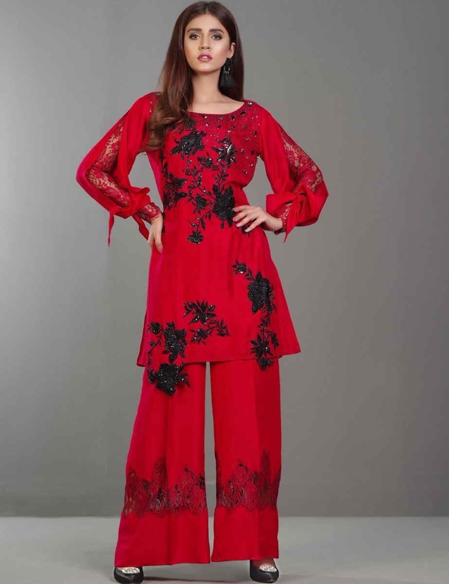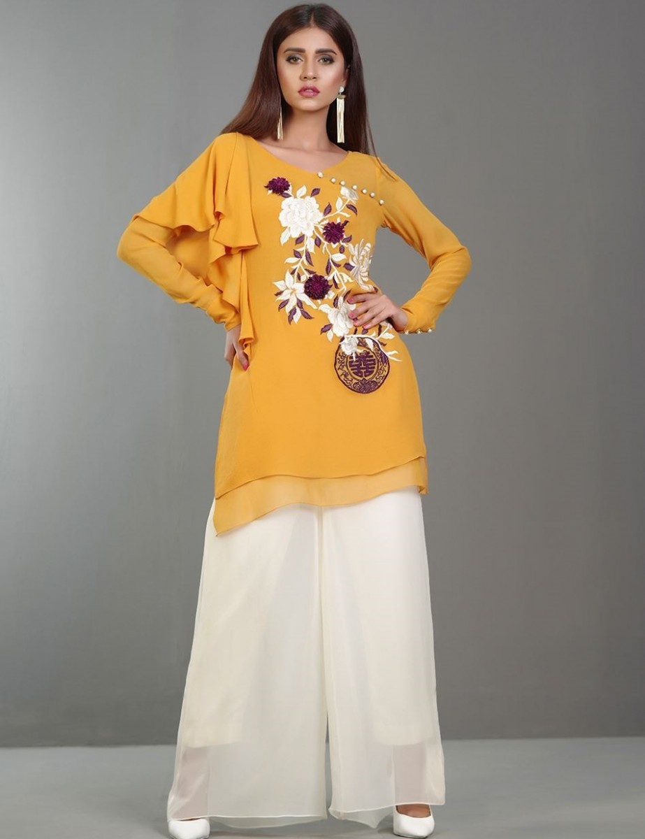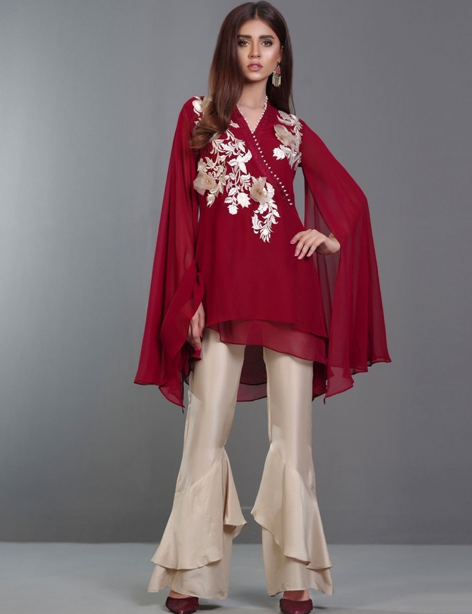 If you are looking for a bit casual and funky dress this festival, then this amazing georgette top in deep plum color with chic embroidery is right here for you. Adding to its charisma is its frill pants decorated with antique buttons.