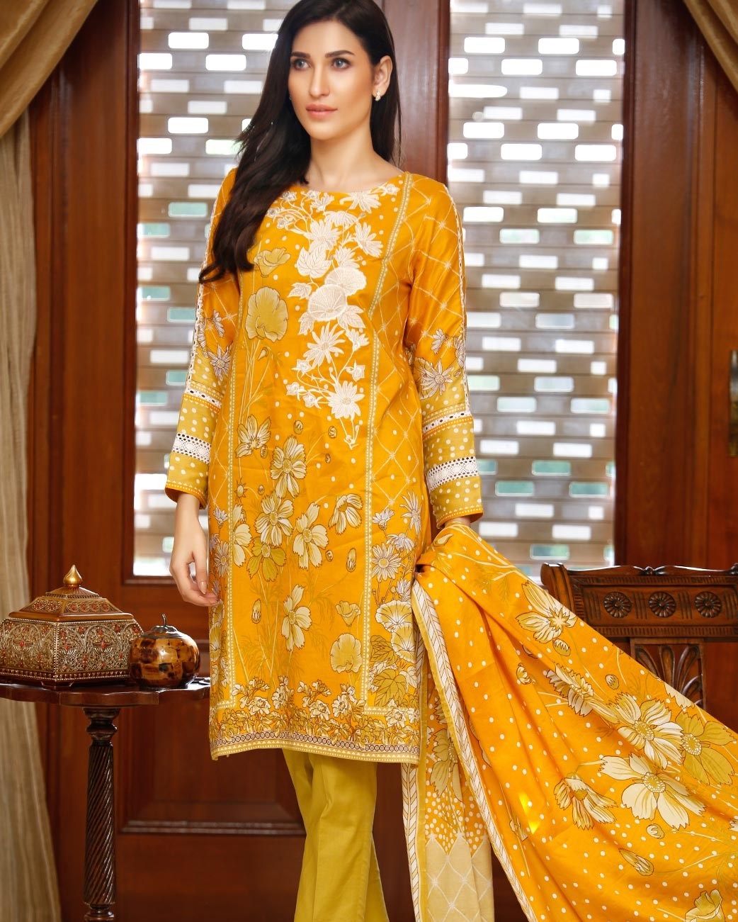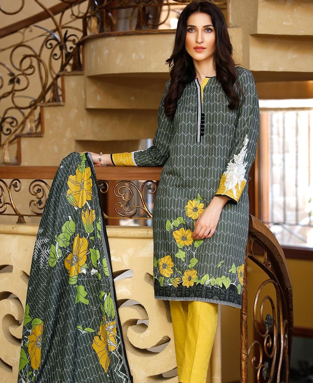 The Amazon Moss Grey cotton khaddar winter outfit by Zeen embellished with bright yellow flowers can give you a magical look this winter. Grab it now from the Zeen store in three thousand one hundred and ninety five rupees.