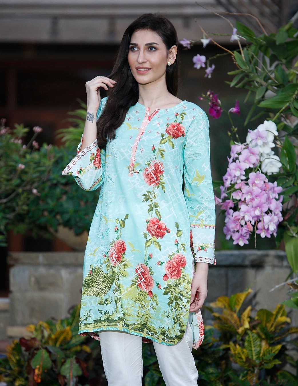 This stunning Aquamarine print embellished with citrus blooms is a chic cotton khaddar apparel complemented with beads and lace.